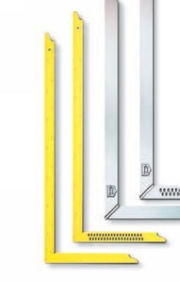 Carpenter’s angle for drawing right angles and precise extension of cutting lines. Yellow, powder coated design with or without marking holes, mm-graduation.