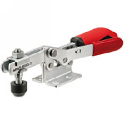 for open and clamped positions. With open clamping arm and horizontal base. Galvanized and passivated. Stainless steel rivets which run in hardened bushes, bearings are lubricated. Ergonomic red oil-resistant plastic handle. Ergonomic, oil-resistant handl