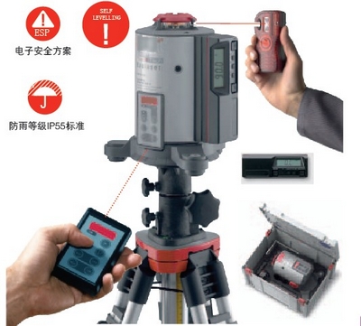 旋转式激光万能倾斜仪,广泛应用于室内、室外、 高大建筑等适用于高质量,节省时间的场合; 可以使用红外遥控器、手握式接收器远距离操控仪器; 使用方便,可以单人操作; 水平准确度±2.6mm/30m, 当仪器收到撞击或发生位移时,激光自动停止发射; 可以用600转/分,300转/分和100转/分的速度旋转, 根据任务选择最佳转速; 线激光模式,可以调节15°,30°和45°激光射窗角度, 产生不同长度的激光投影线段; 点激光模式,可以遥控向左或向右, 可以近处直接选择激光扫描点线速度的快慢, 也可遥控达到目的
